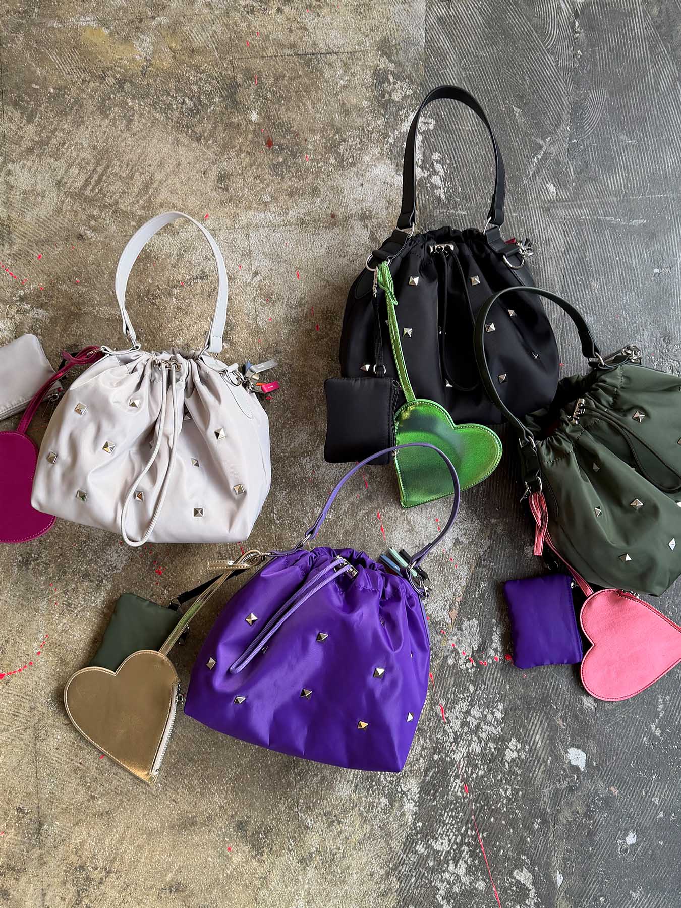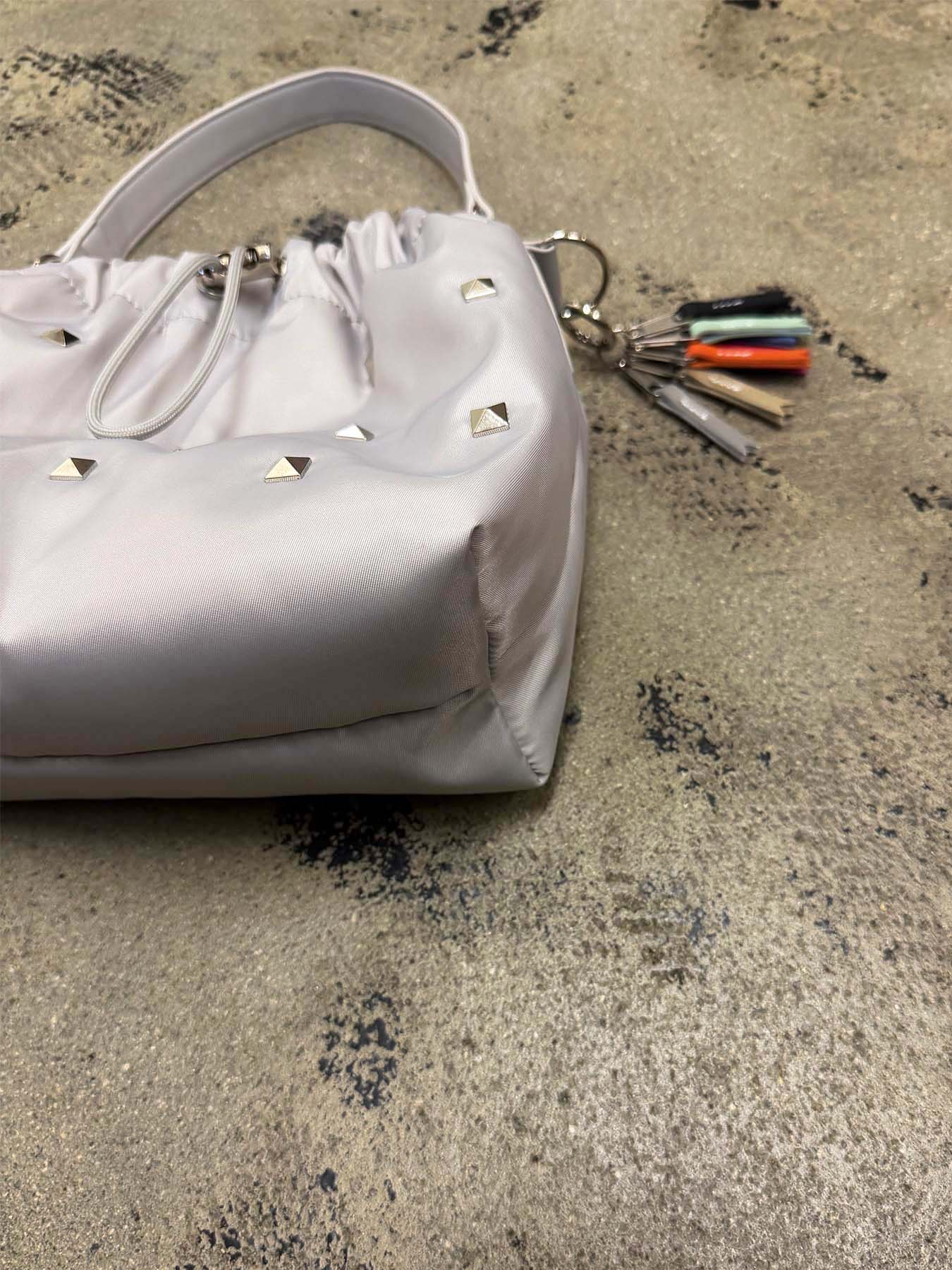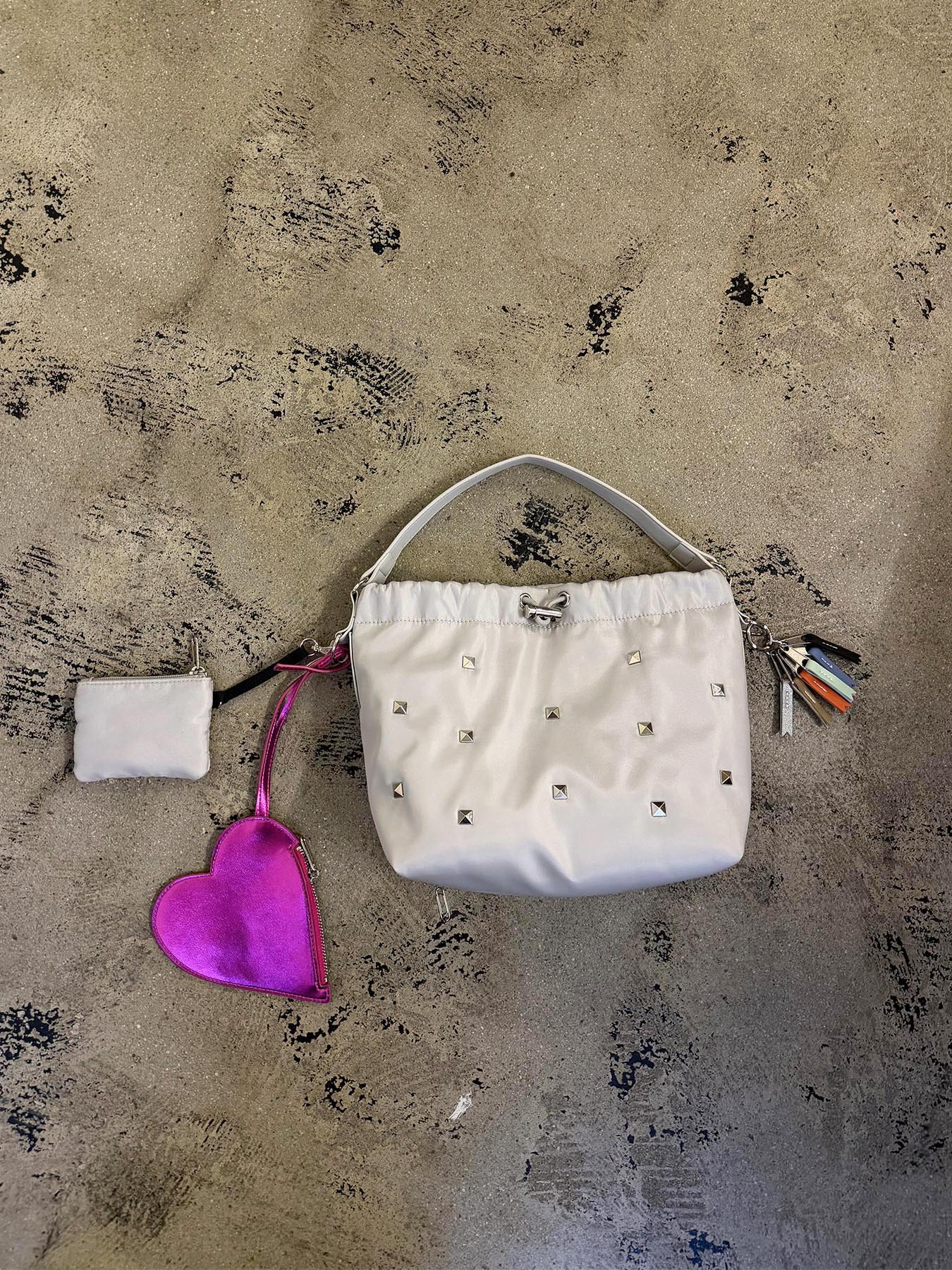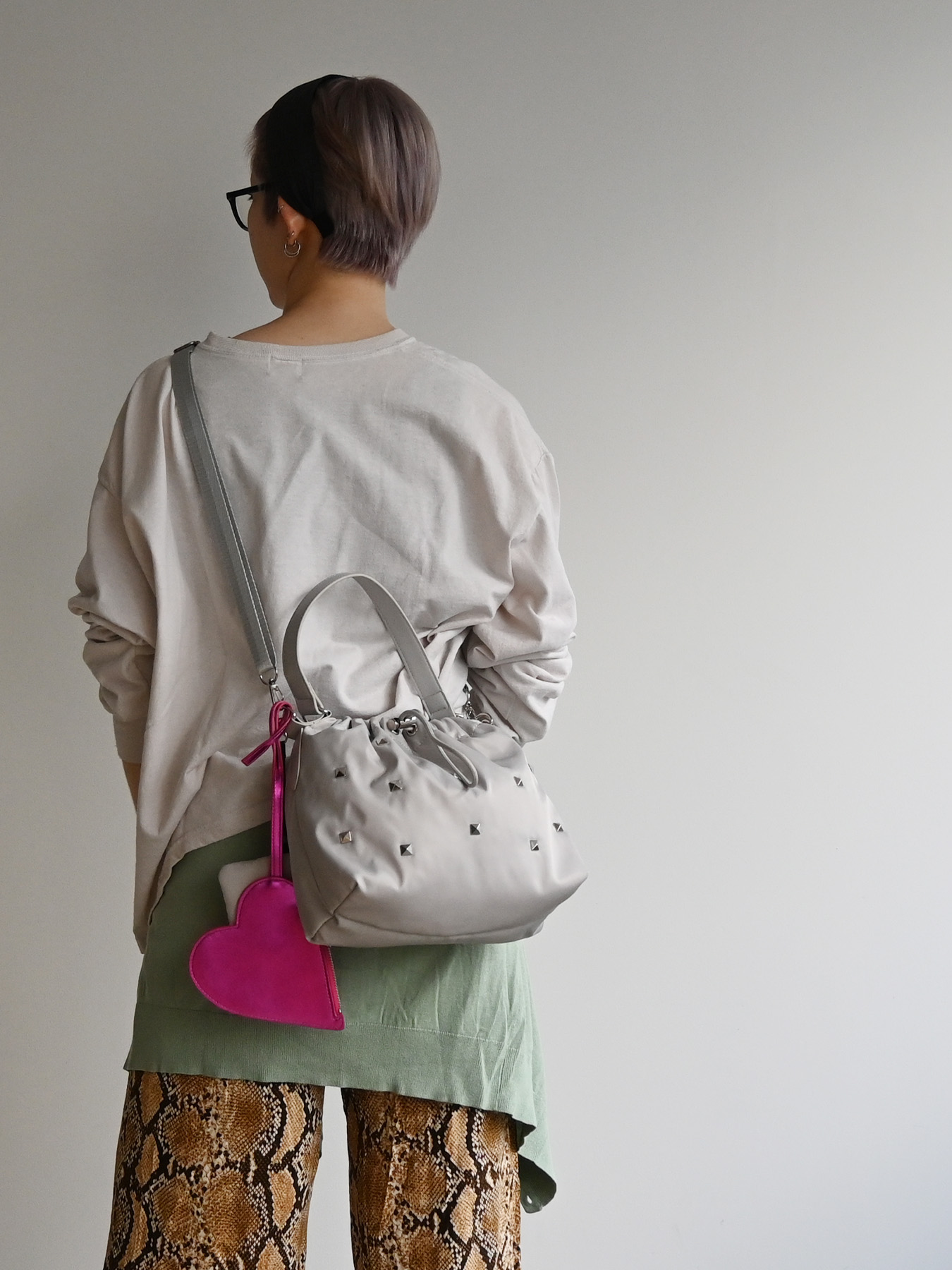 ふんわり中綿入りの本体にはスタッズが散りばめられた巾着バッグ。