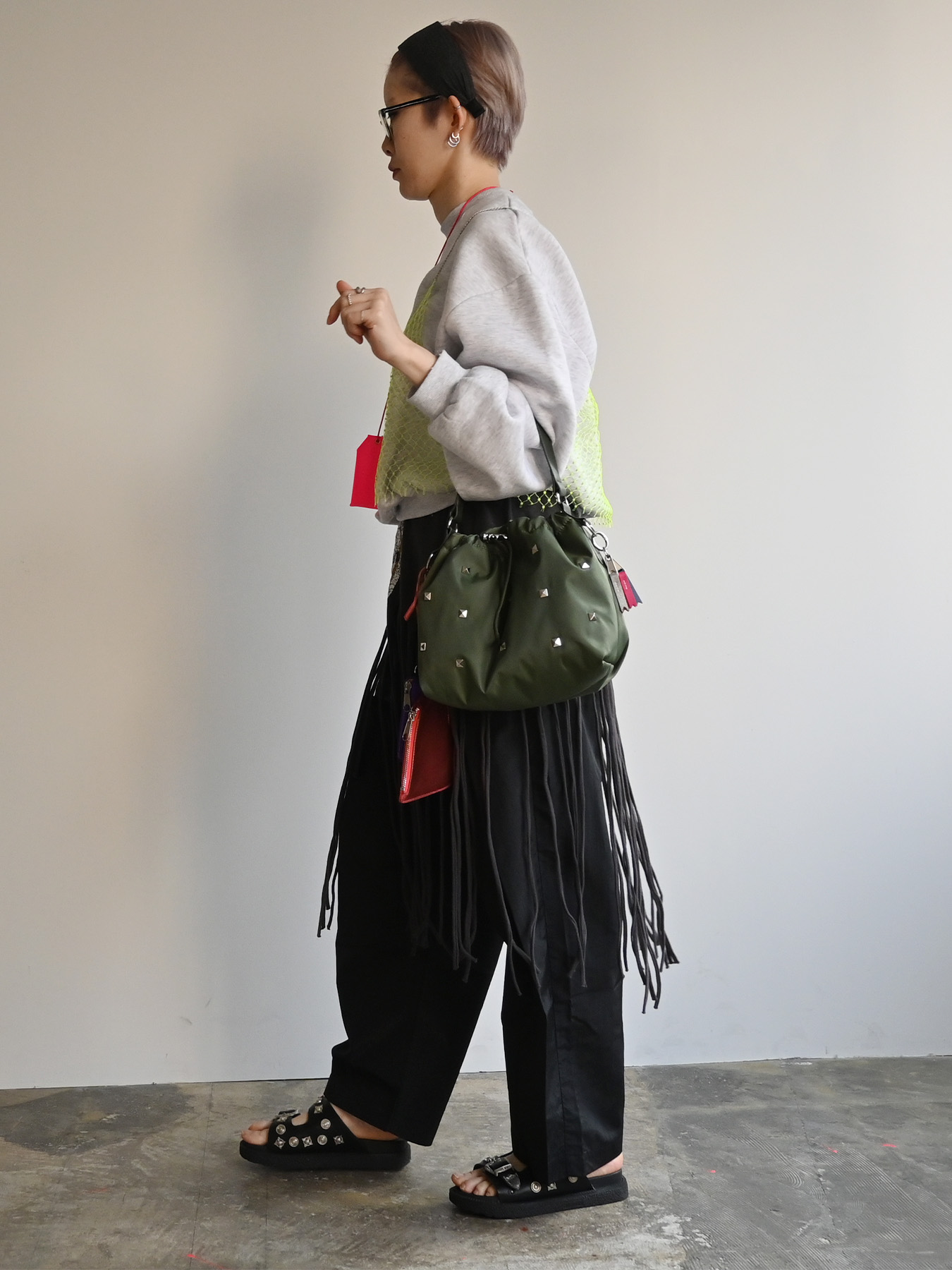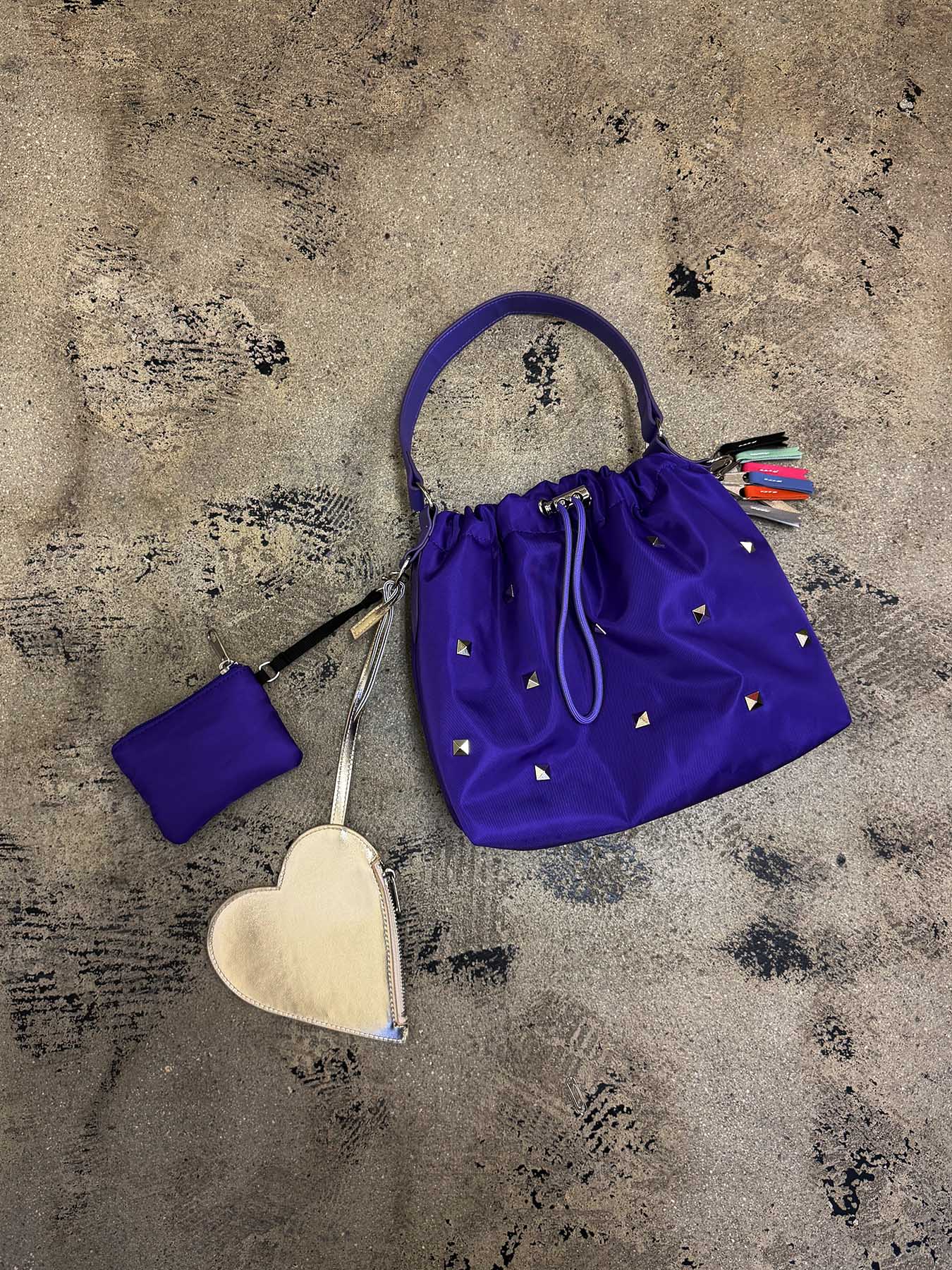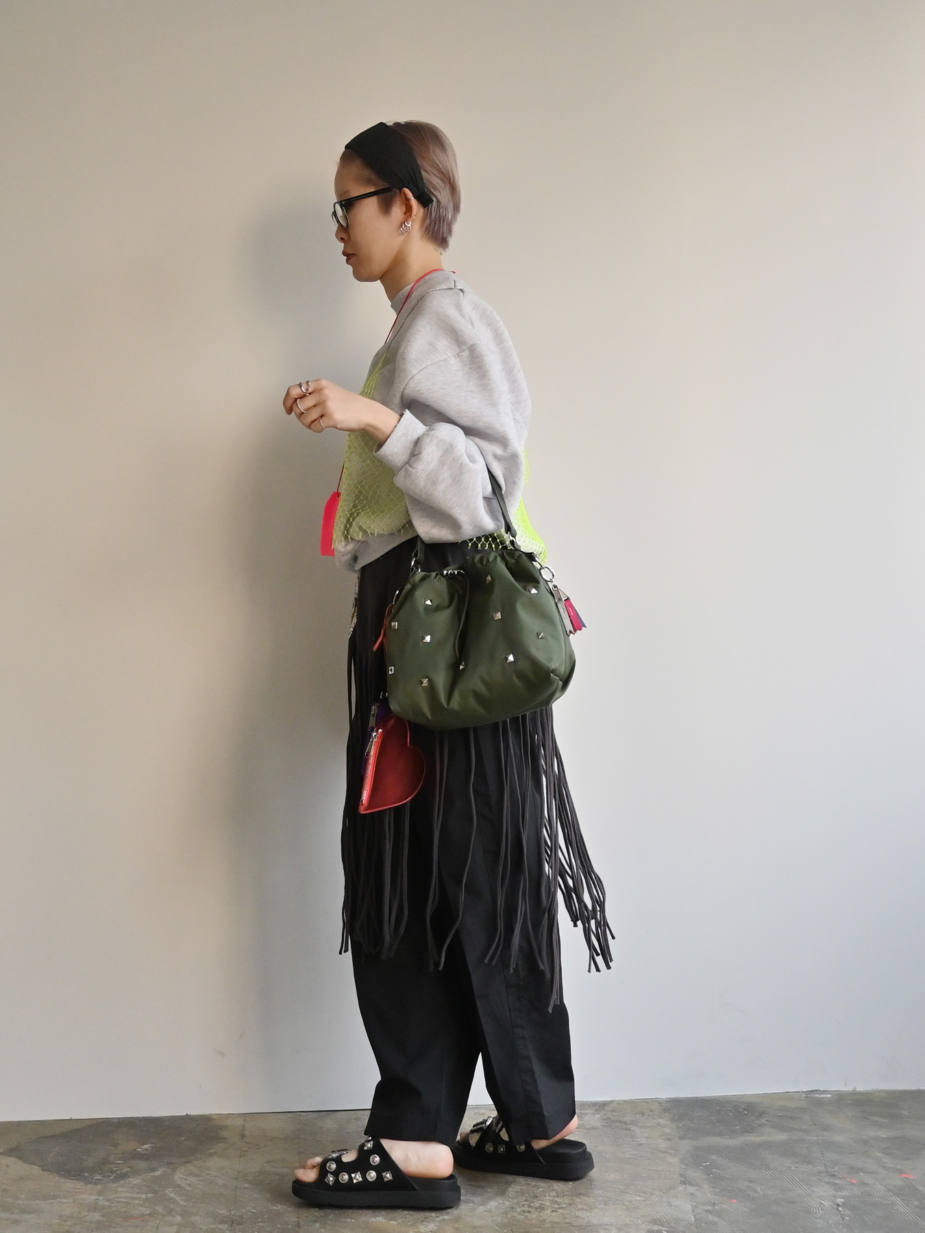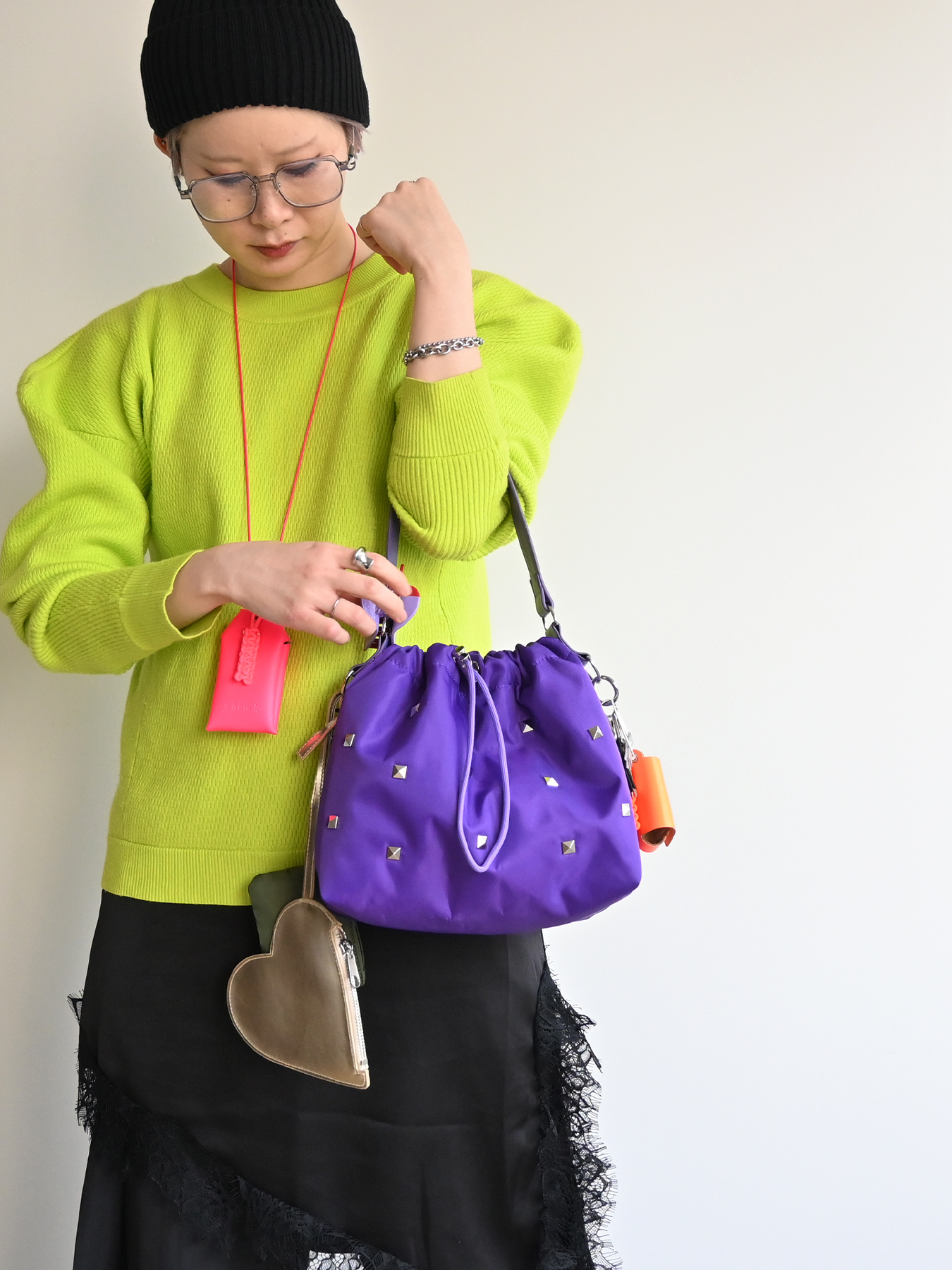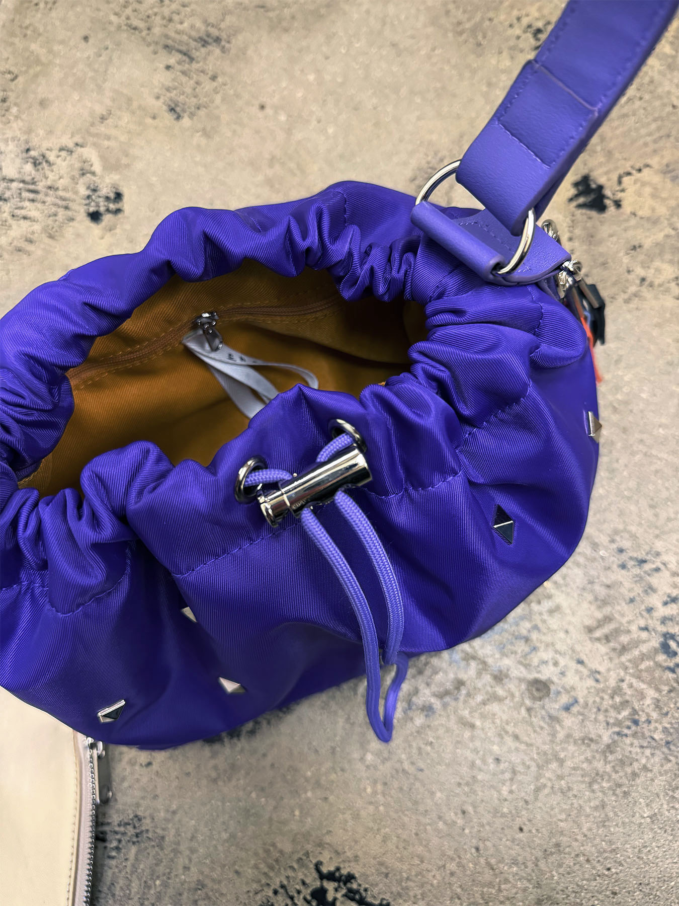 ふんわり中綿入りの本体にはスタッズが散りばめられた巾着バッグ。