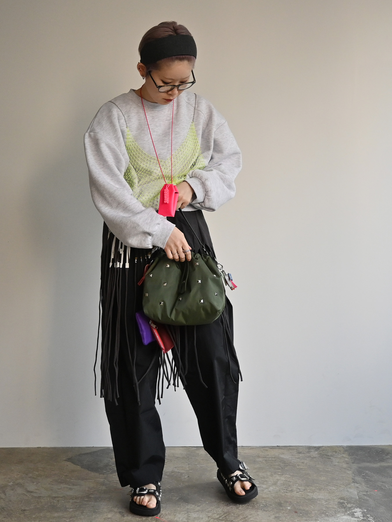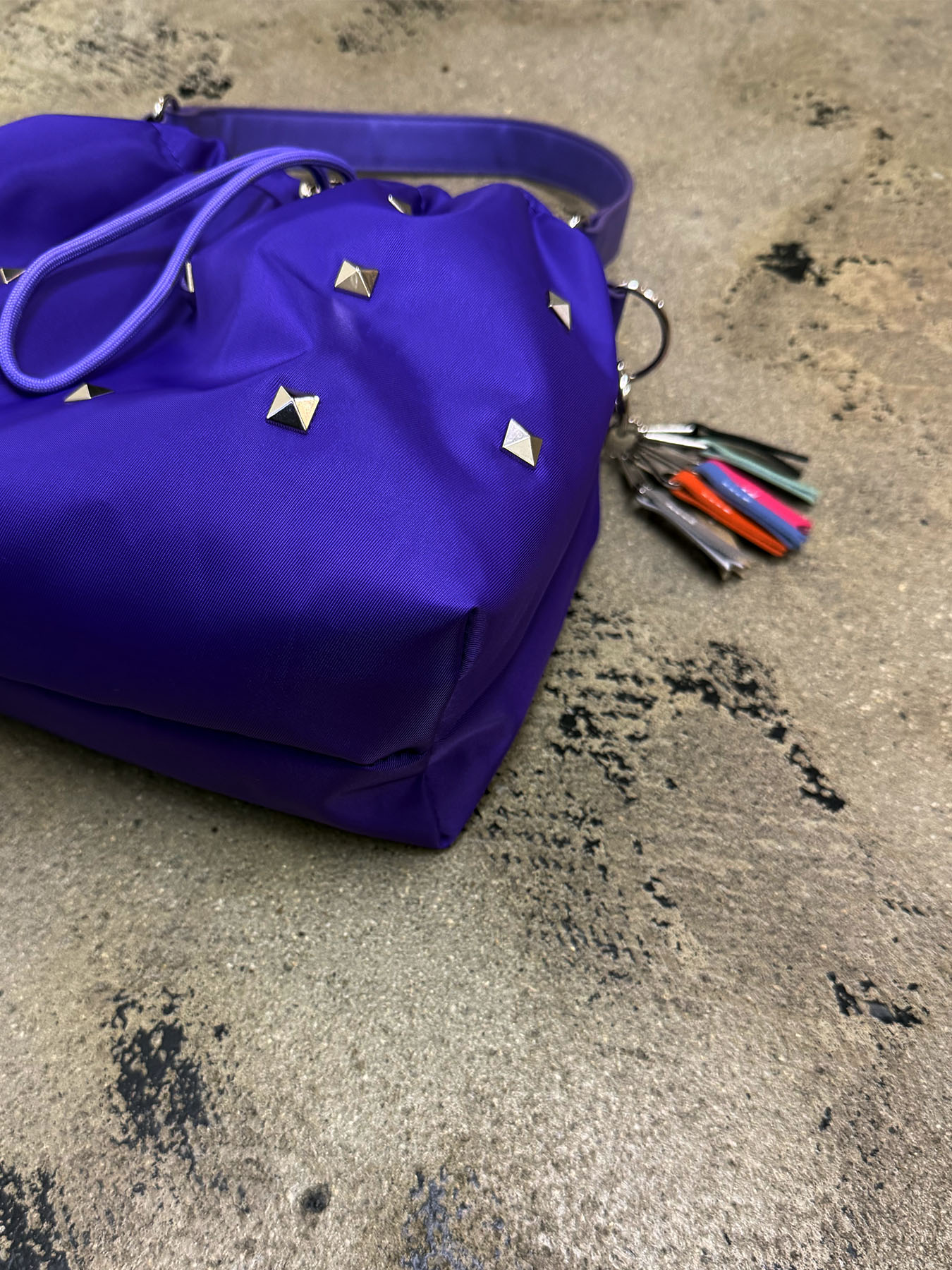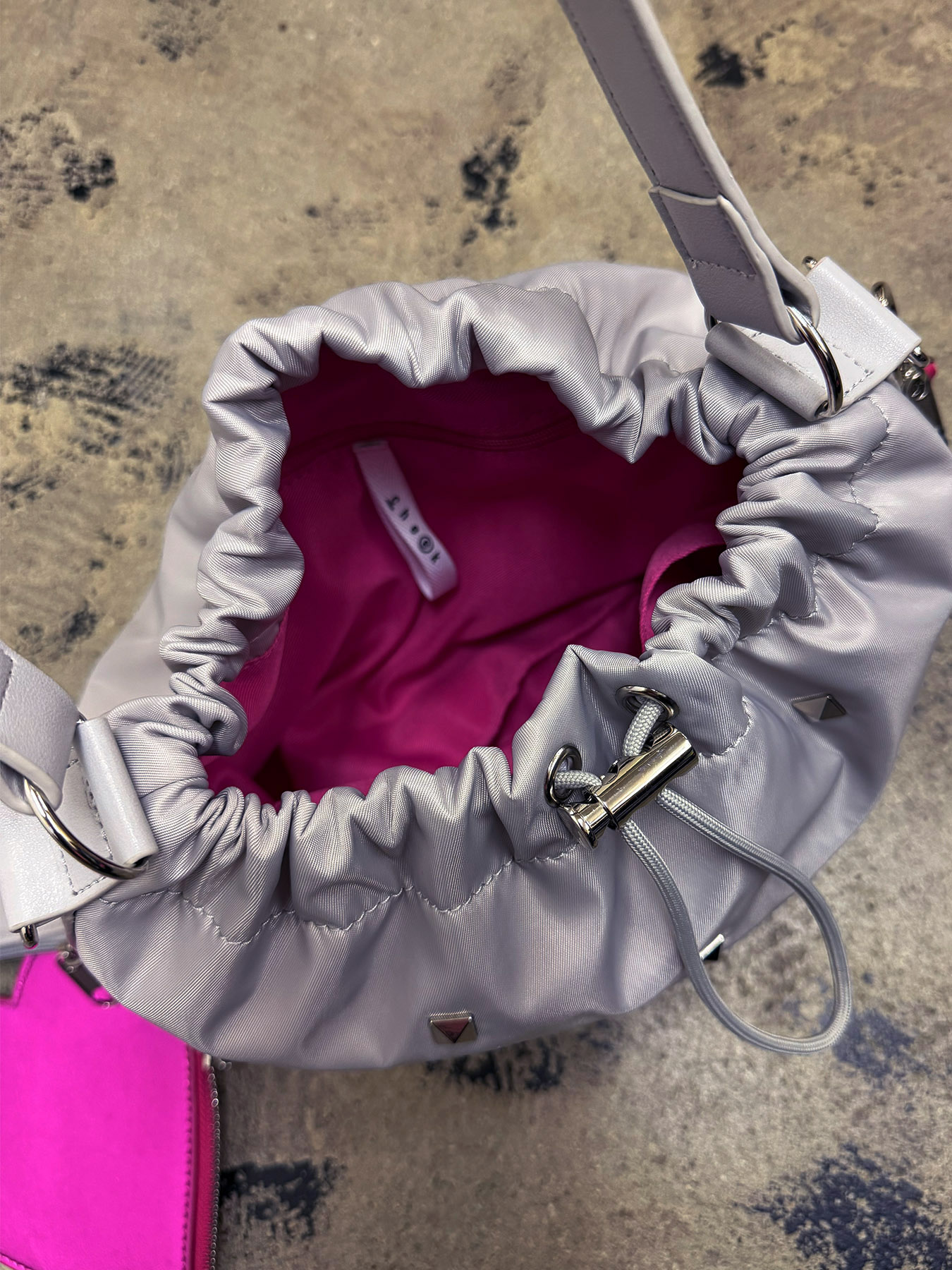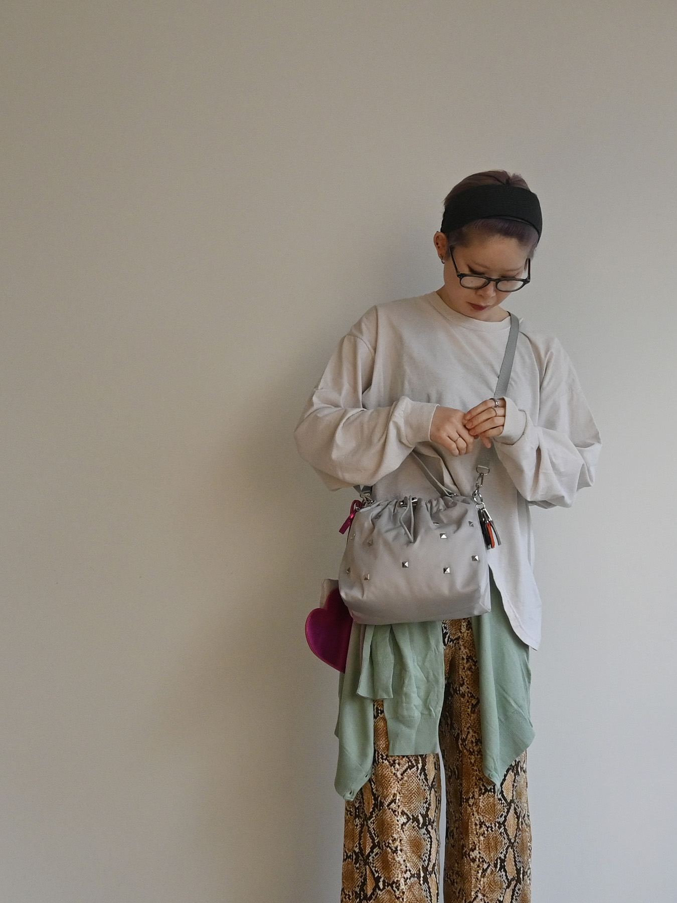 ふんわり中綿入りの本体にはスタッズが散りばめられた巾着バッグ。