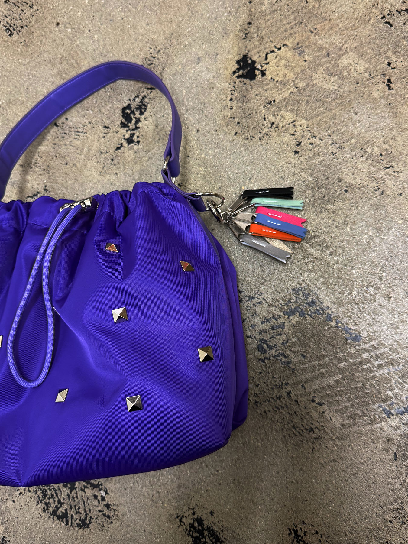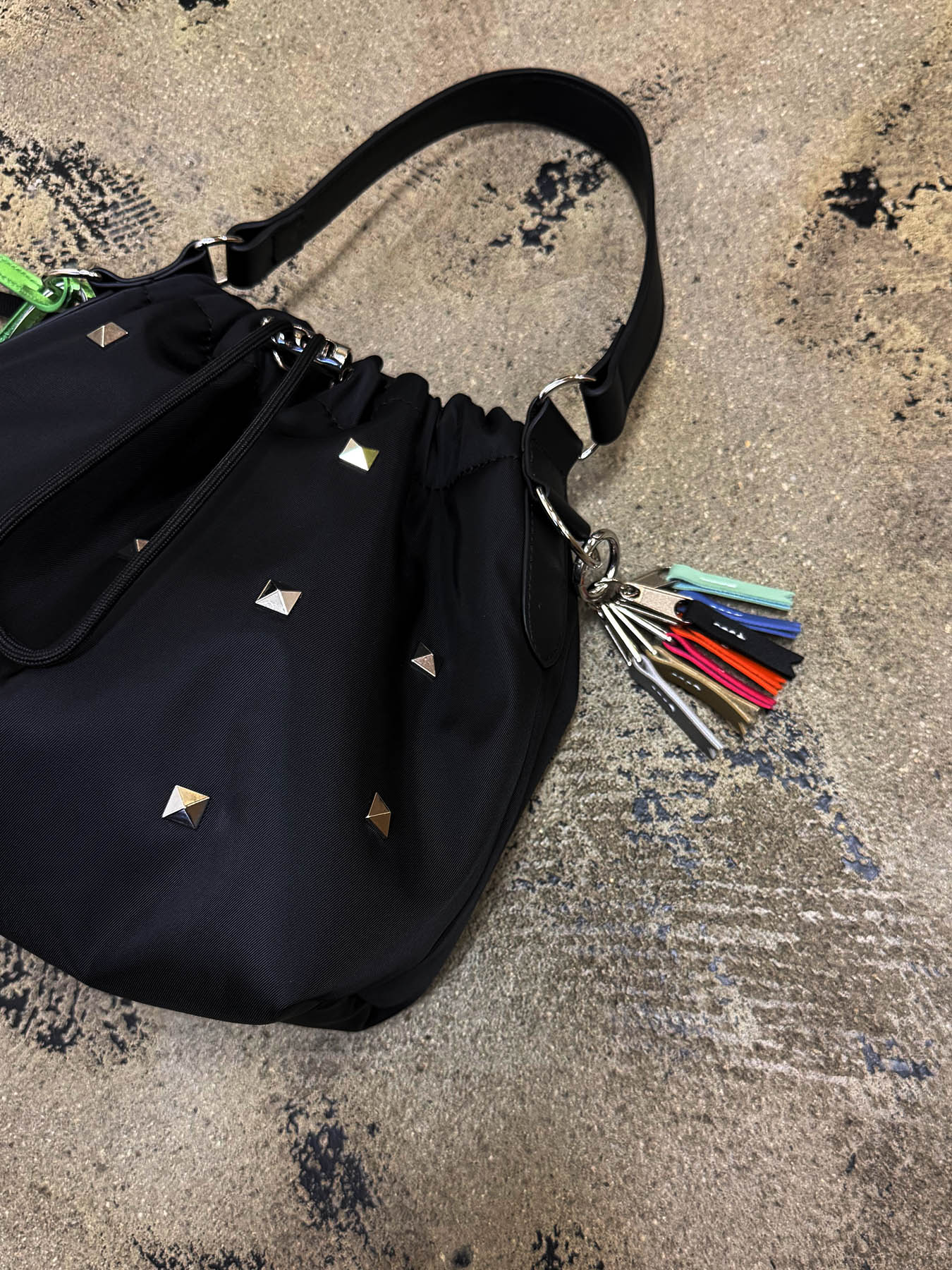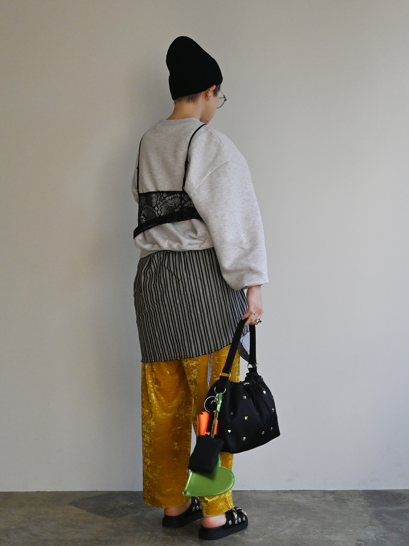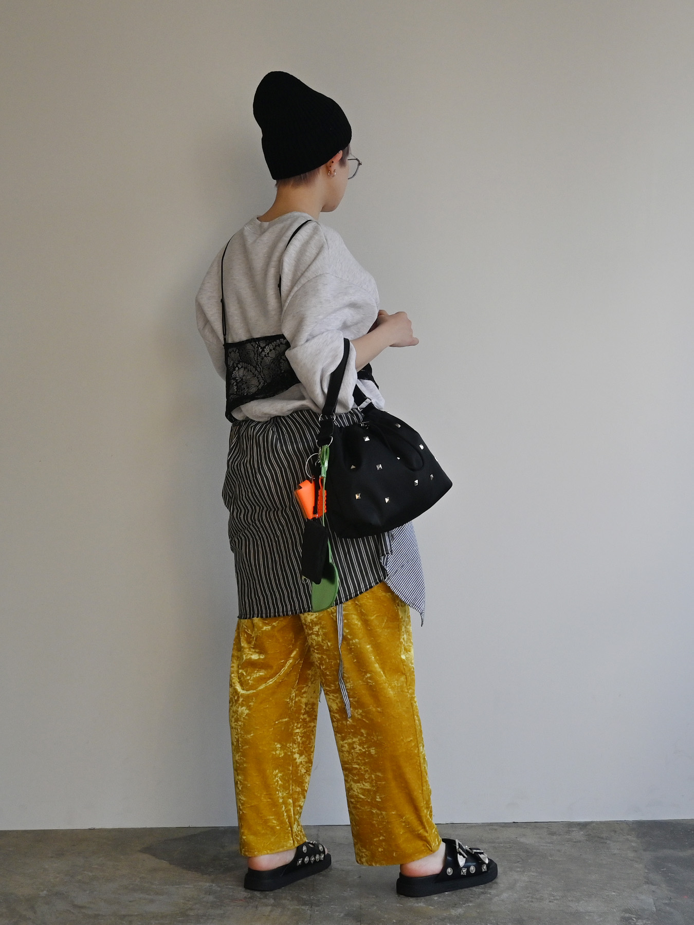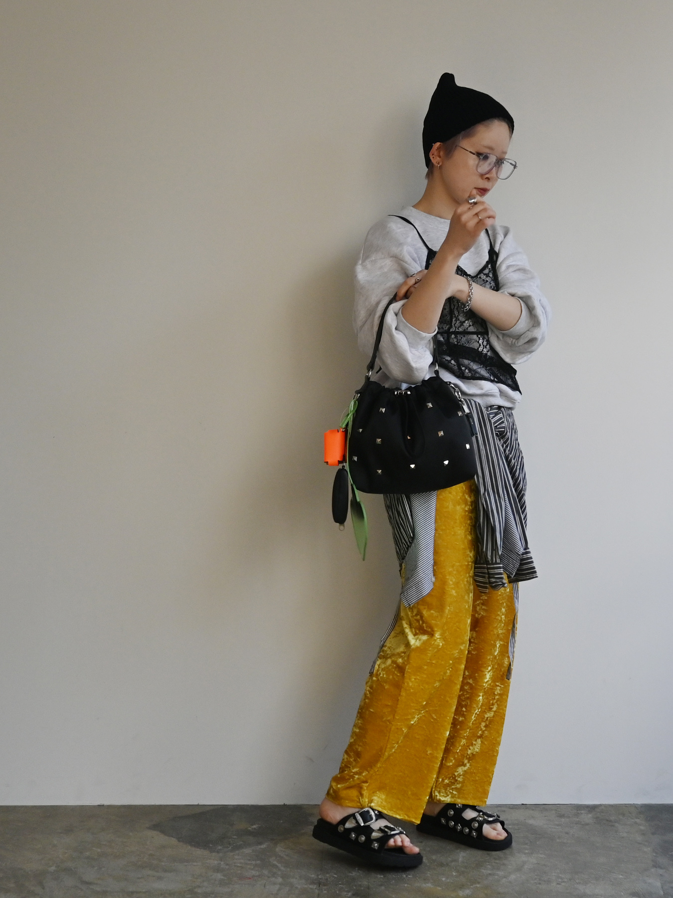 ふんわり中綿入りの本体にはスタッズが散りばめられた巾着バッグ。