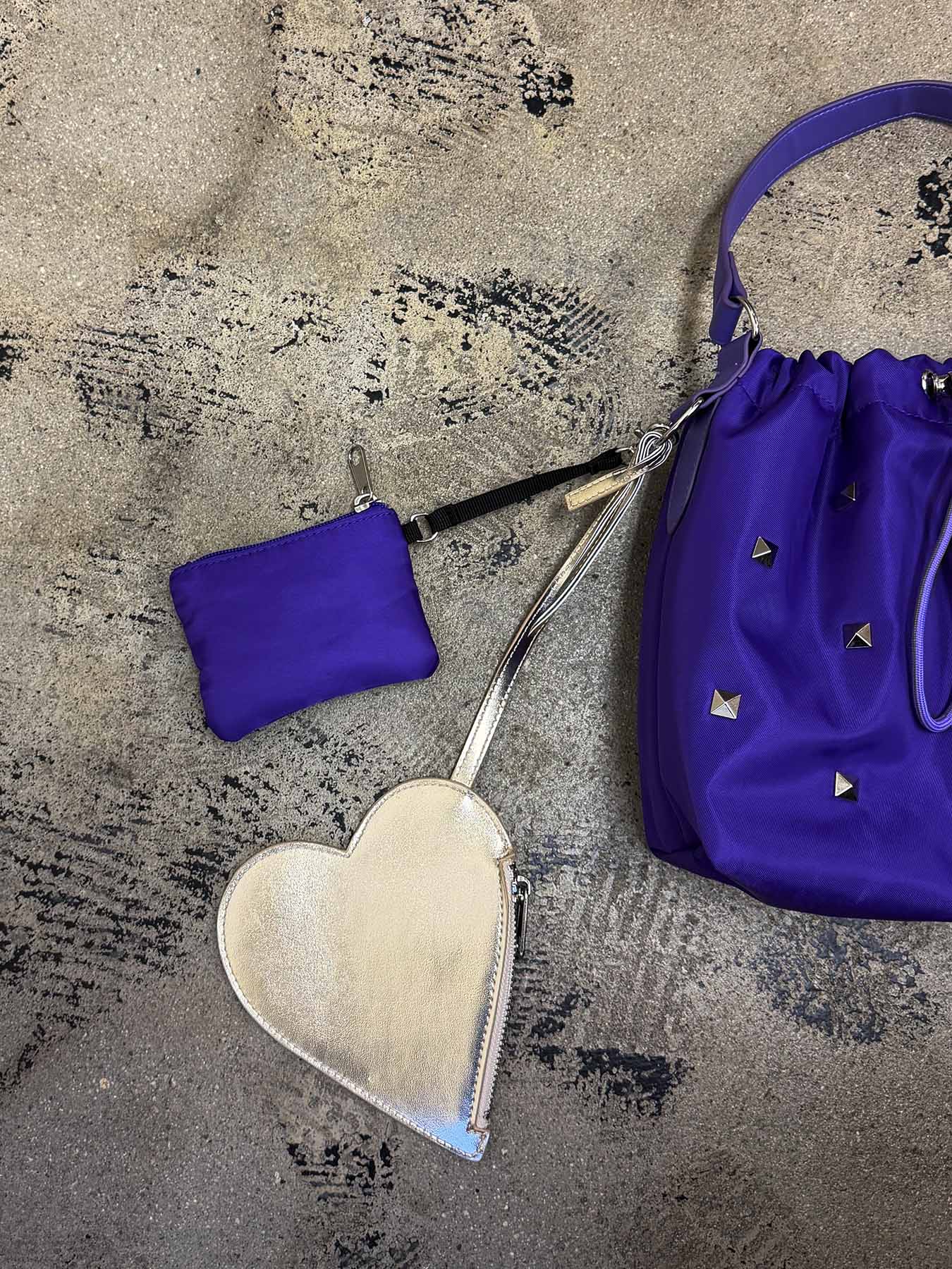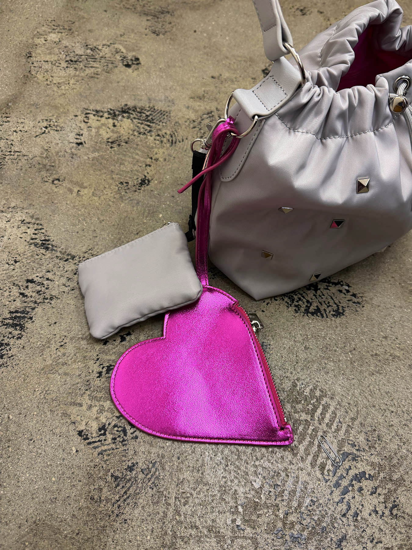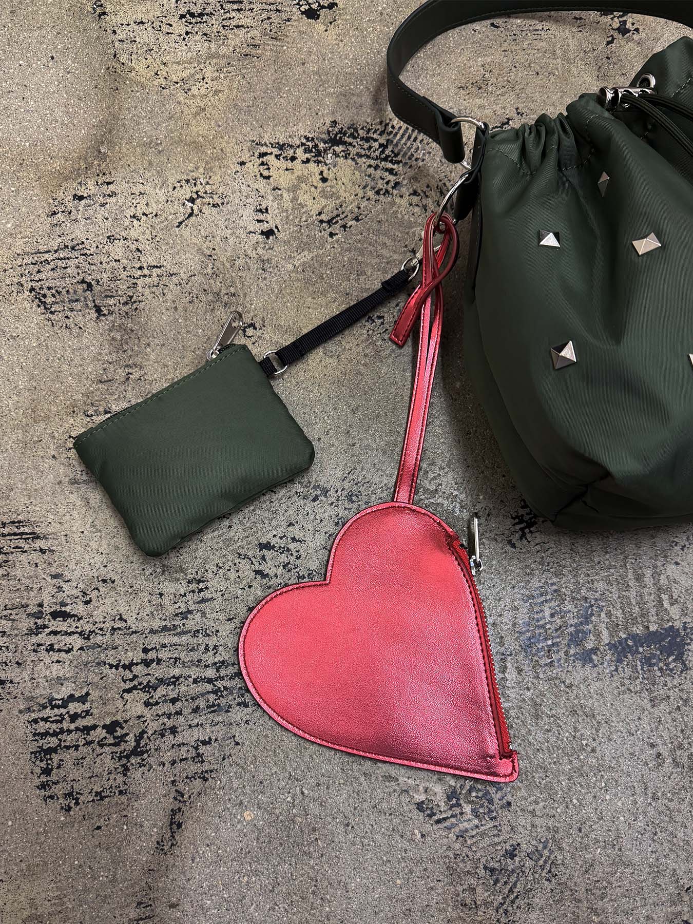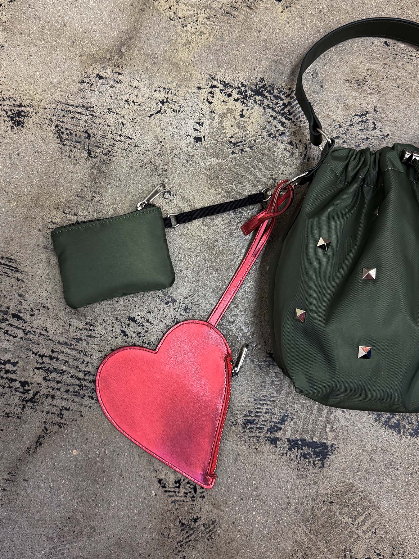 ストラップ部分にはハートモチーフポーチとミニポーチのチャームセットがついており、