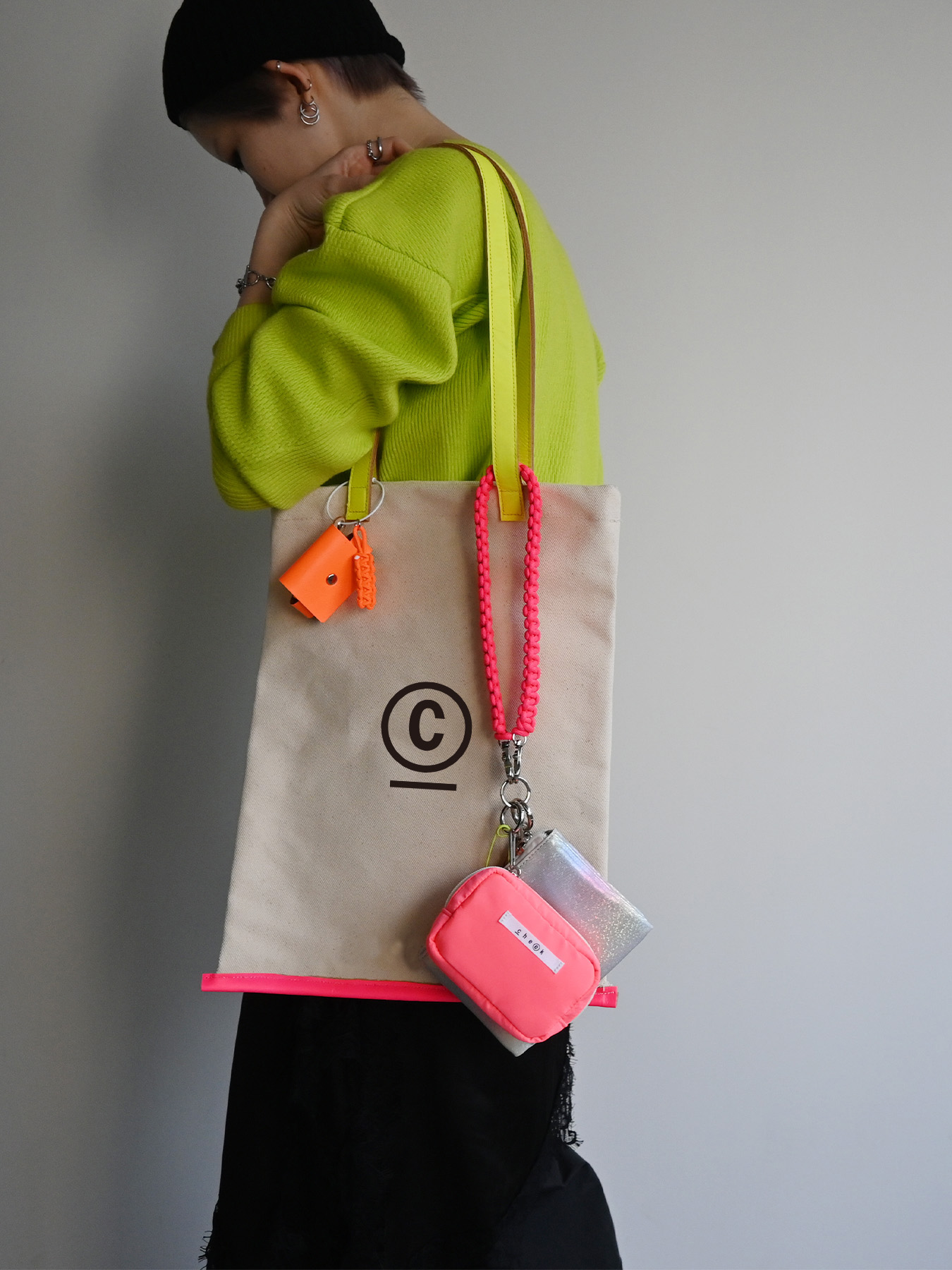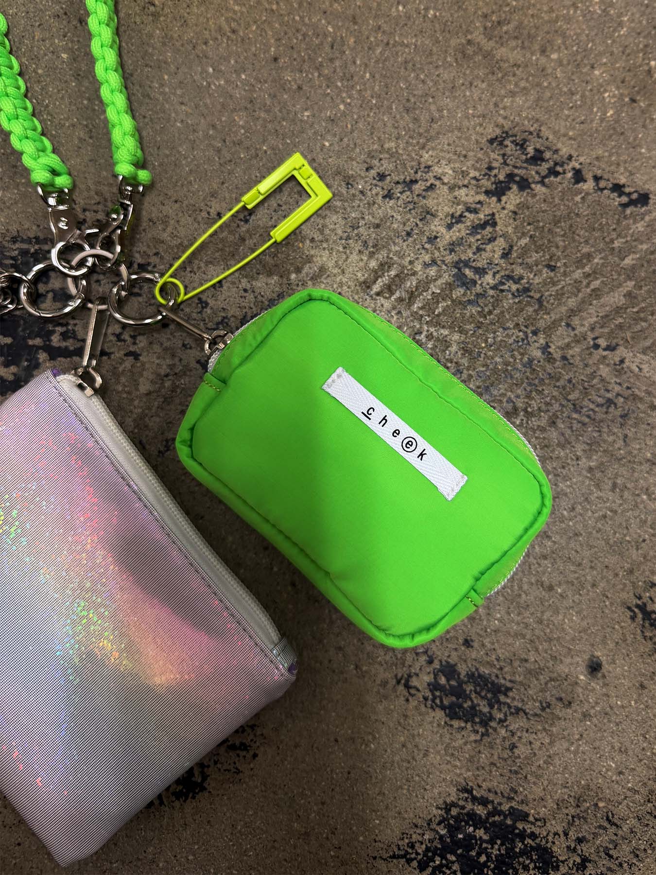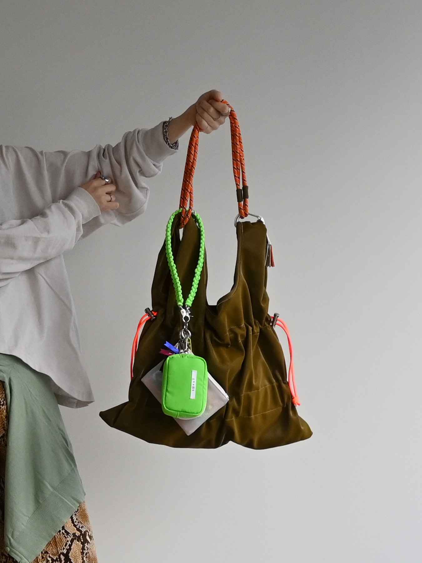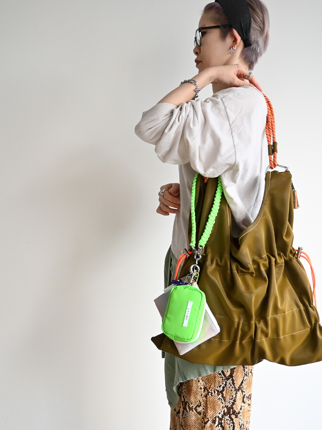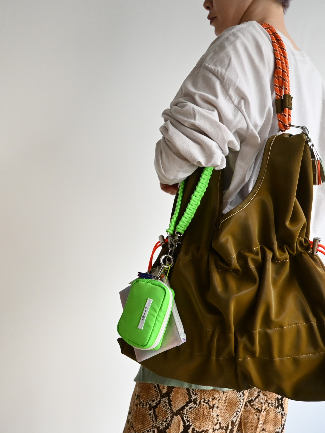 ネオンカラーのストラップをベースにミニポーチをフラグメントケース、