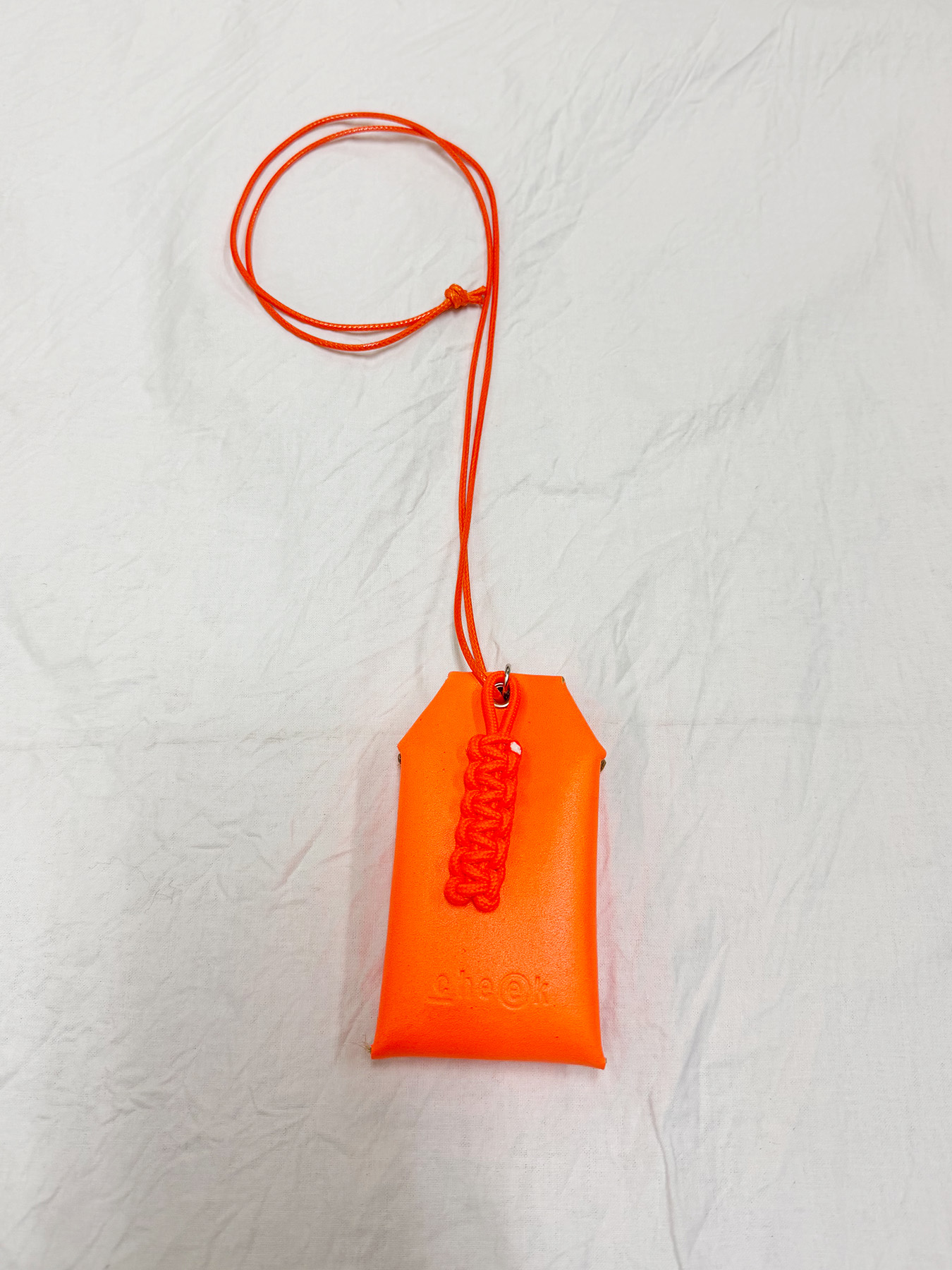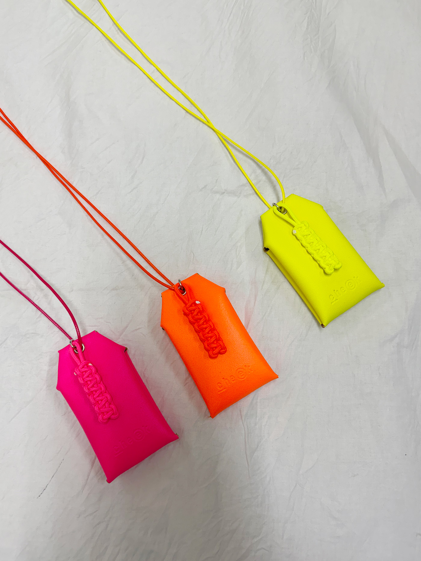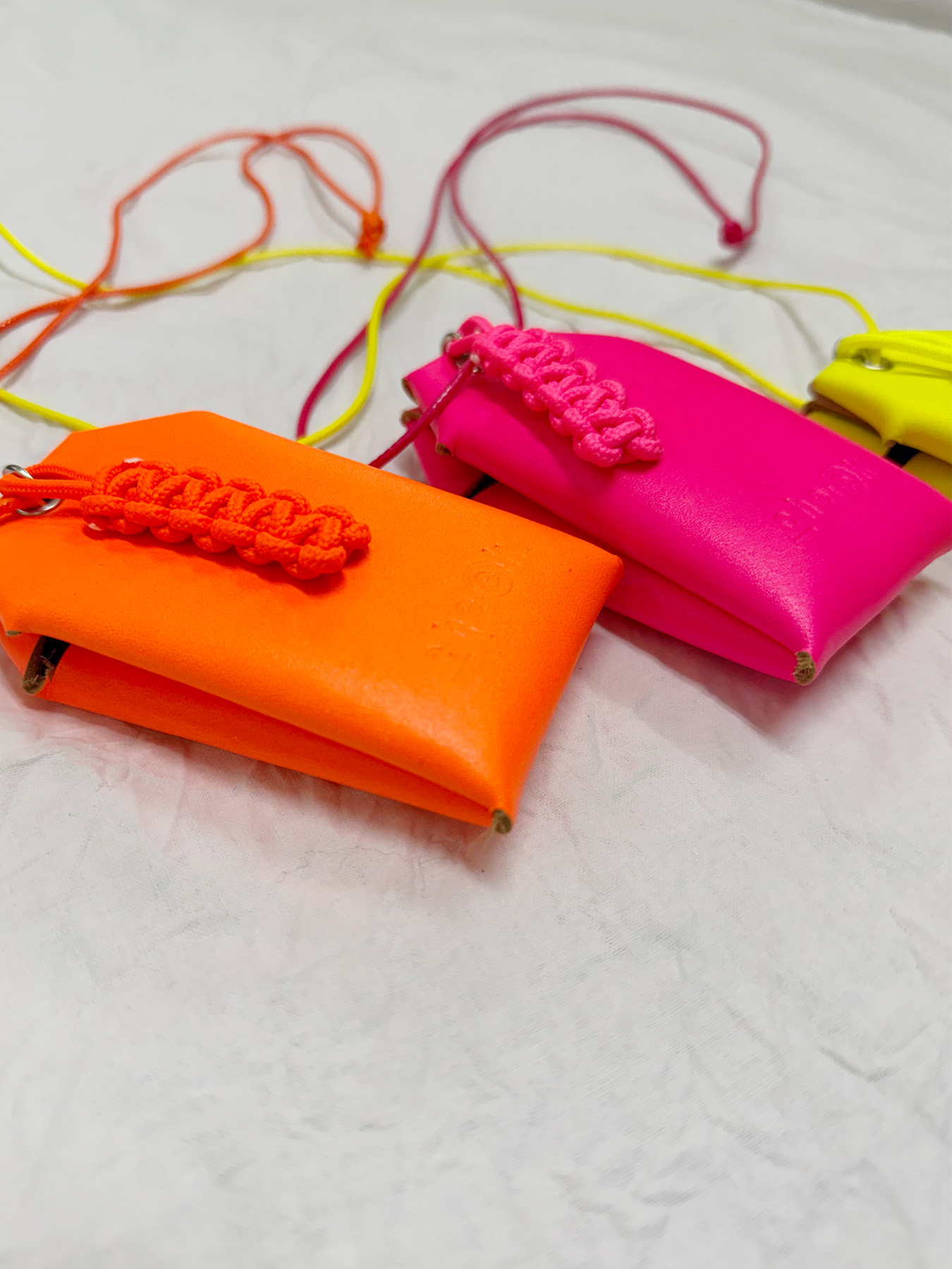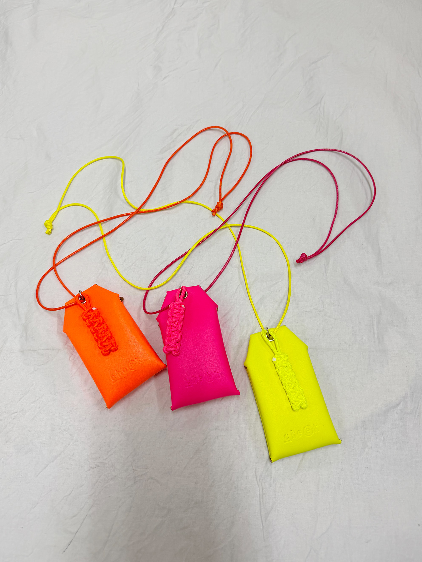 ネオンカラーが目を惹く、お守りデザインのネックレス。