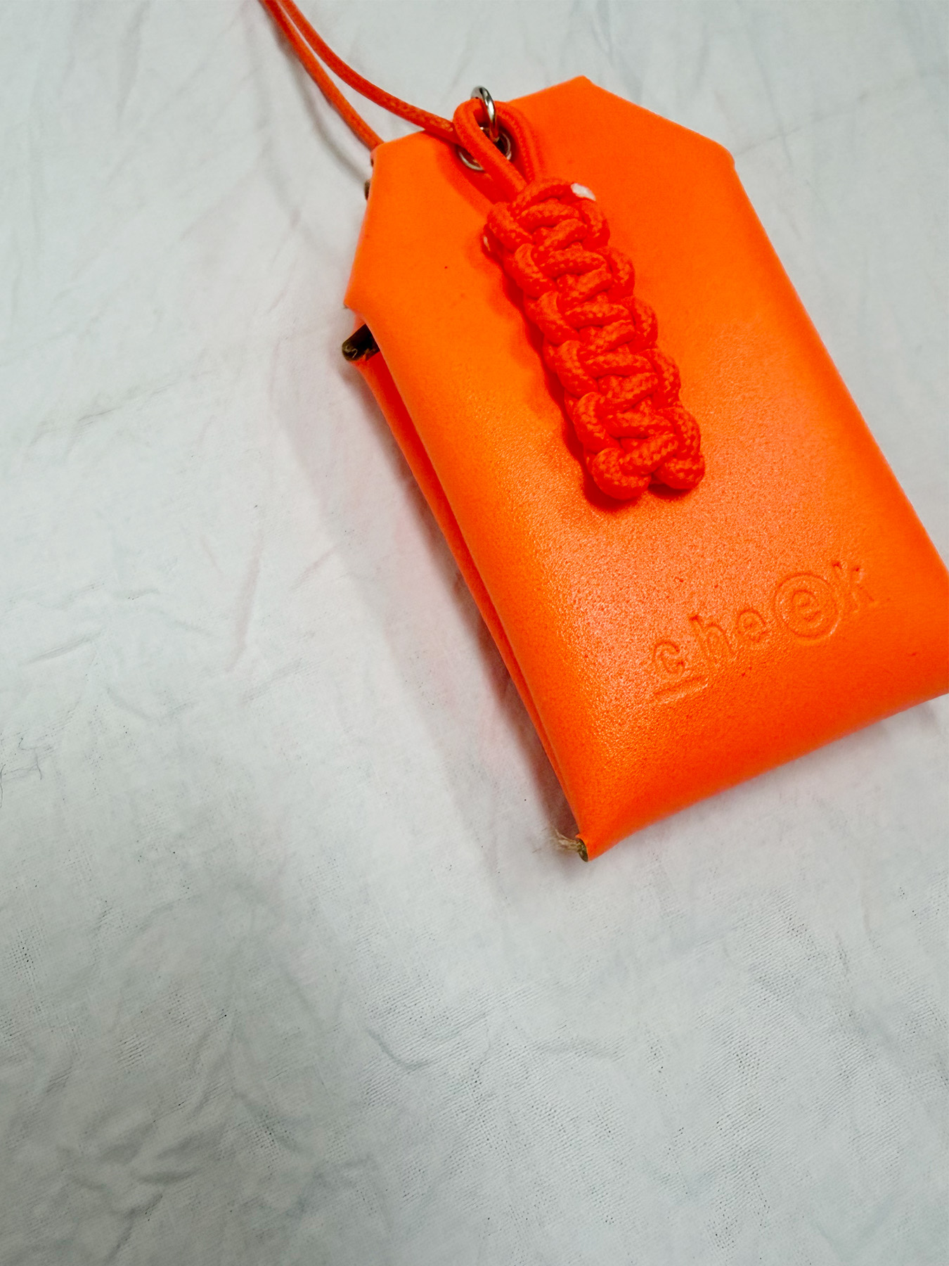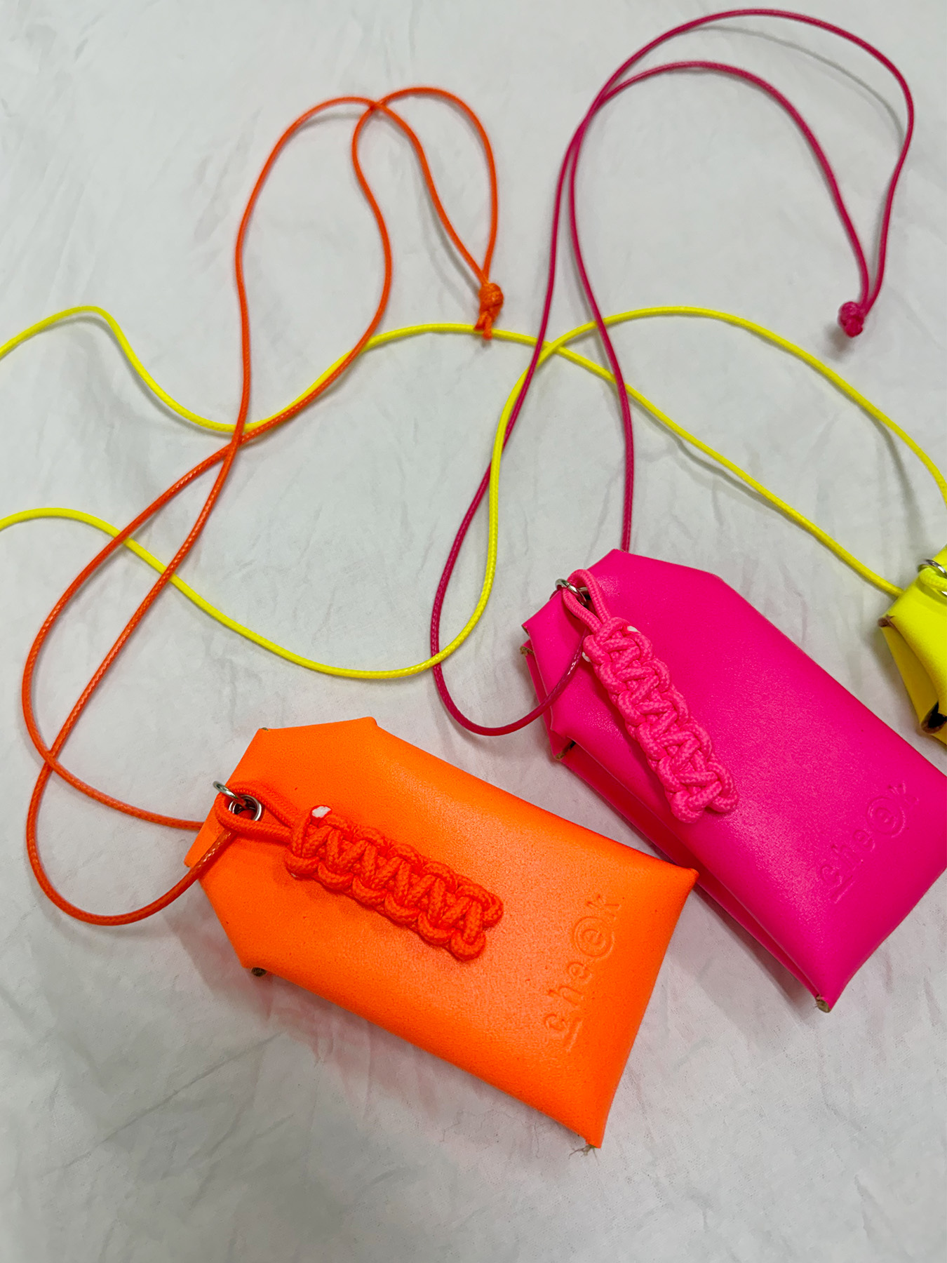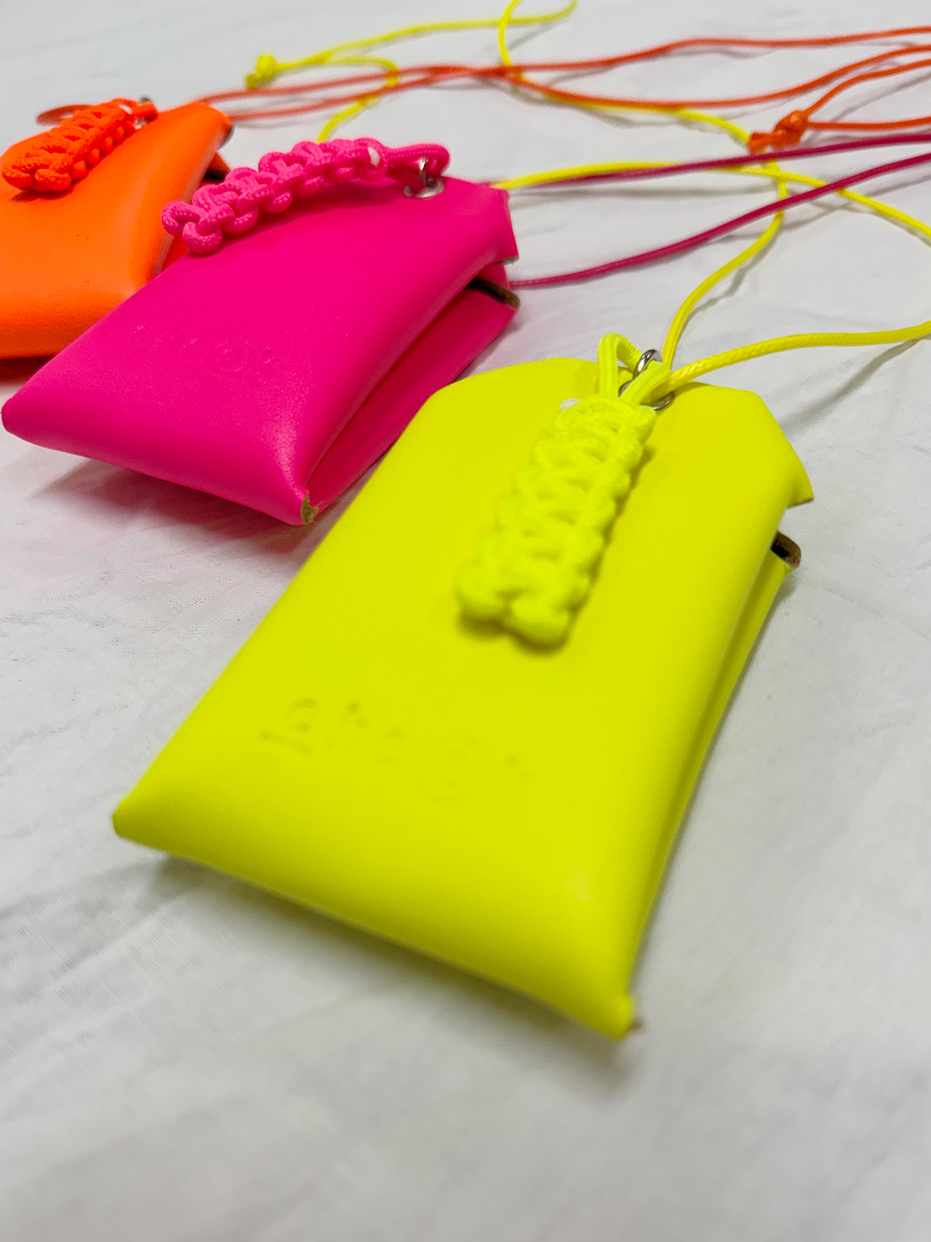 ネオンカラーが目を惹く、お守りデザインのネックレス。